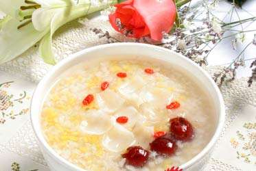 80g hạt ngô, gạo nếp 40g và đường cát đỏ 40g (ngô và gạo nếp nên được ngâm trong nước sạch trong 2 giờ), thêm một lượng nước thích hợp, đun sôi trên lửa lớn, sau đó nấu trên nhiệt độ thấp cho đến khi mềm và nấu trong 5 phút. Bởi vì ngô có chứa chất chống oxy hóa và các thành phần khác có lợi cho sức khỏe con người, món cháo này có lợi cho những người bị thiếu Qi và cơ thể yếu để tăng cường cơ thể. Ăn nhiều người bị thiếu Qi có thể giảm bớt các điều kiện sức khỏe phụ của họ.