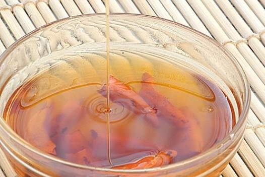 6. Nấu cho đến khi dầu trở nên rõ ràng, tắt lửa và đổ nó vào một cái bát để múc một cái muỗng khi ăn. Trong quá trình bay hơi của độ ẩm, gluten cay được thu thập sẽ tan chảy vào dầu. Dầu được nấu theo cách này có màu tối và có hương vị êm dịu