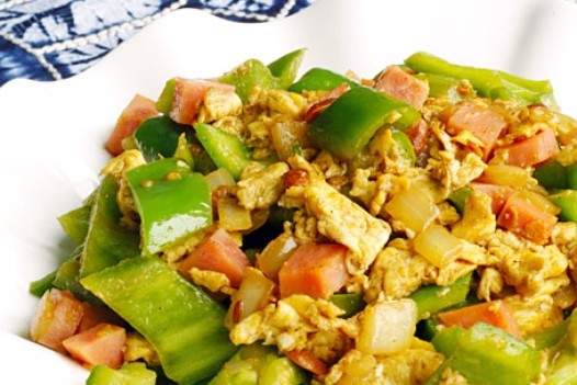 280 gram hạt tiêu xanh, 2 quả trứng, 70 gram giăm bông30g hành tây, 1 thìa hành tây đồng hành, một ít muối, 1/4 muỗng rượu, 1/4 muỗng giấm trắng