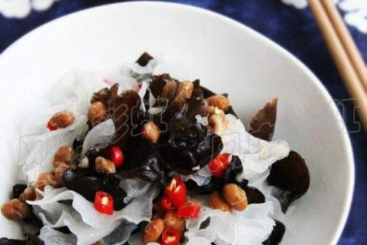 1. Đổ nước vào nồi sôi, và đặt nấm đen và tremella đã bị xé thành những bông hoa nhỏ vào chúng, trong khoảng 3-5 phút. Nếu bạn muốn hương vị trở nên thô hơn, bạn có thể làm sạch nó và lấy nó ra, ngâm nó trong nước đá và thoát nước. 2. Sau khi lấy ra natto trước, khuấy nó bằng đũa trong một vài lần cho đến khi nó bị dính và cắt nhỏ, sau đó trộn Natto và đôi tai đen trắng với nhau