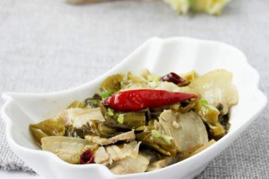 4. Sau 70% dầu trong nồi nóng, thêm tỏi, hành lá và gừng băm trong một thời gian, sau đó thêm dưa cải bắp và hạt tiêu ngâm vào xào