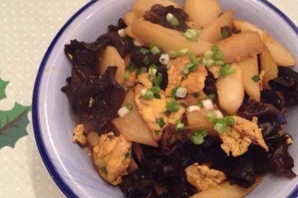 1 yam, một số nấm đen, 3 quả trứngMột ít hành tây, một chút tươi vào tháng 6, một ít nước tương cho một lượng nhỏ bữa tiệc Taitai le, một lượng nhỏ dầu