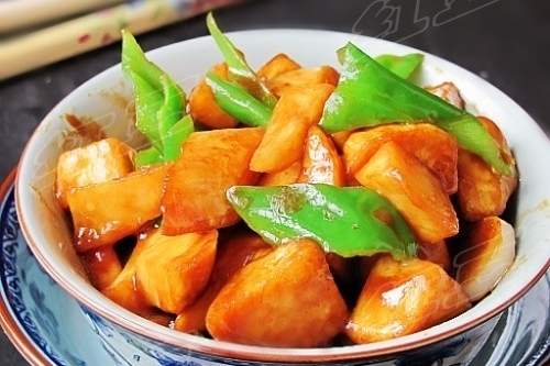 2. Gọt vỏ và cắt hạt dẻ nước thành từng miếng, rửa và cắt hạt tiêu xanh thành từng miếng.