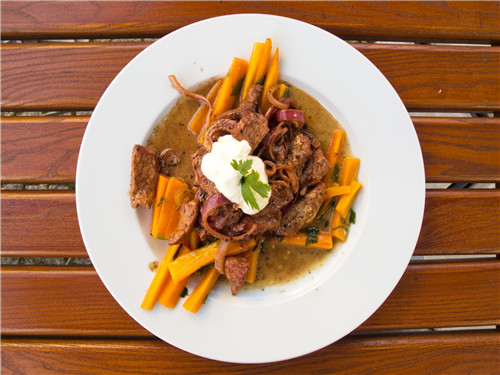 1 lát thịt bò là khoảng 225g, một nửa hành tây, 1 cà chua thịt bò, 1 củ cà rốt Nước sốt, 1 muỗng cà phê đường và lượng hạt tiêu đen thích hợp