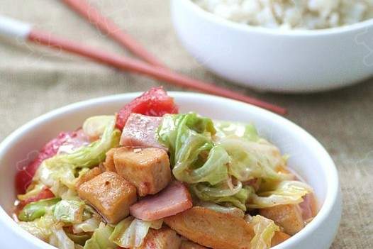 Nửa một bắp cải, 5 lát đậu phụ, 2 cà chua1 lát giăm bông, 1 muỗng cà phê mỗi hành tây xanh băm và gừng (5 gram) 1 muỗng canh nước tương (15ml) 1/2 muỗng cà phê bột năm loại (3 gram) 1/2 muỗng cà phê muối (3 gram)1/2 muỗng cà phê đường (3 gram)