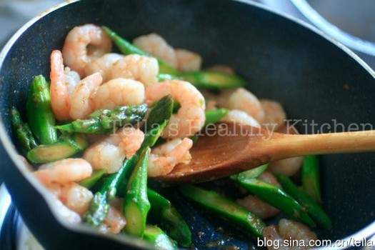 8. Thêm tôm và măng tây, thêm muối và biến nó một cách đều