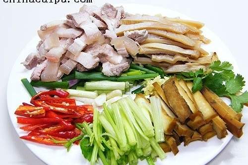 150 gram thịt lợnLượng hẹ thích hợp, lượng cần tây thích hợp, 4 quả ớt đỏ Chaotian, 1 muỗng cà phê gừngThành phần rượu 2 muỗng canh tỏi 2 muỗng canh nước tương 1 muỗng cà phê sốt hàuĐường trắng (không cần thêm muối.