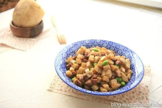 <img alt = "Mô tả minh họa về phương pháp xào Lotus rễ Thịt lợn thái hạt lựu với đậu nành với đậu nành, đậu nành, v.v., và để chúng đứng trong 10 phút