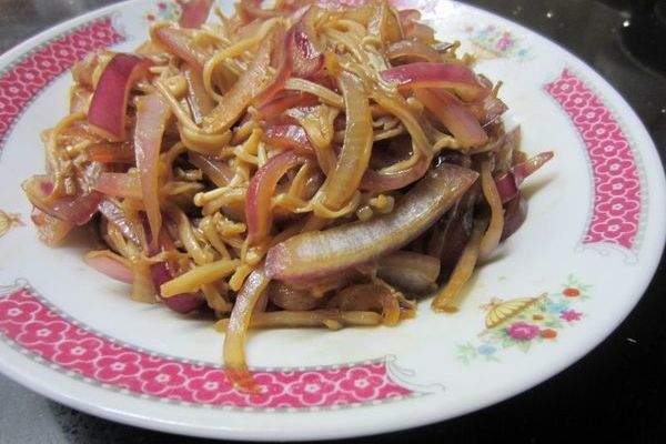 1. Gọt vỏ hành tây và cắt nó thành các mảnh vụn, và xé nó ra sau khi cắt rễ của nấm Enoki.