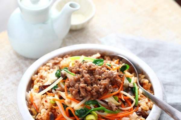 thành phần60g mầm đậu tương, cà rốt 50g, thịt bò băm nhỏ, 1 muỗng canh nước sốt bibimbap đặc trưng1 muỗng cà phê dầu mè, lượng rượu thích hợp, 1 muỗng cà phê nước tương tiêu chuẩn vàng, muối hạt tiêu bột