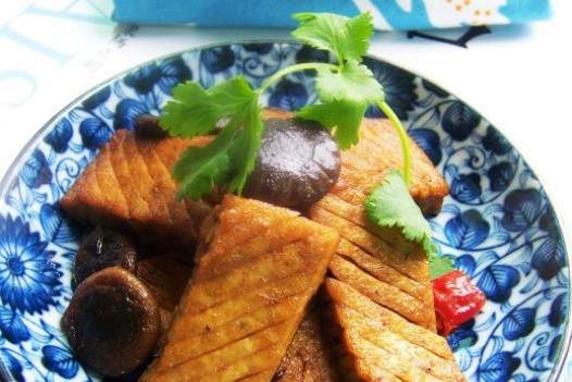5. Sau khi xào ra mùi thơm, đổ vào đậu phụ khô và nấm, thêm nước tương nhẹ, nước tương sẫm màu, và mười ba loại gia vị, và đổ nước của nấm ngâm với dư lượng được lọc và cát vào nồi