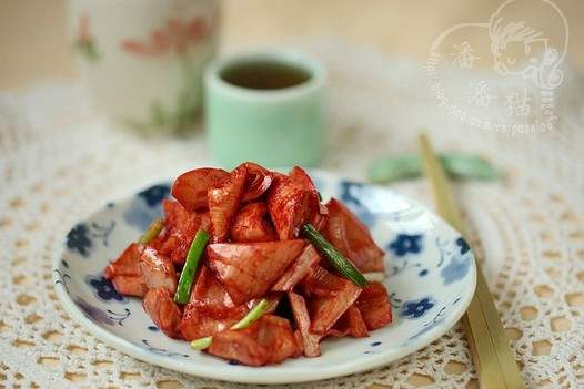 5. Thêm một thìa nhỏ của đường và nếm nó. Nếu hương vị là ánh sáng, bạn có thể thêm một lượng muối thích hợp. Đặt các lát hành lá trước khi rời nồi và xào đều trước khi phục vụ trên tấm
