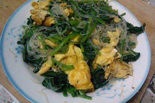 3. Đặt rau bina vào nước nóng và làm mờ nó, lấy nó ra và ngâm nó trong nước lạnh. nó Cắt rau bina thành các miếng nhỏ dài khoảng 3 cm. nó Hủy bỏ các vermicelli đã ngâm và cắt nó thành các miếng nhỏ bằng kéo. nó Thêm một ít dầu vào chảo và làm nóng nó lên và thêm một lượng hành tây màu xanh lá cây thích hợp, xào cho đến khi có mùi thơm, sau đó thêm rau bina vào xào trong 1 phút. nó Thêm vermicelli và chiên trên nhiệt độ cao. nó Thêm các khối trứng rán, thêm một ít muối và MSG, và khuấy đều và bỏ nó ra khỏi nồi.