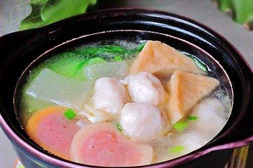 2. Cắt những quả bóng cá, đậu phụ cá, lát giăm bông và bụng nước vào thịt hầm.