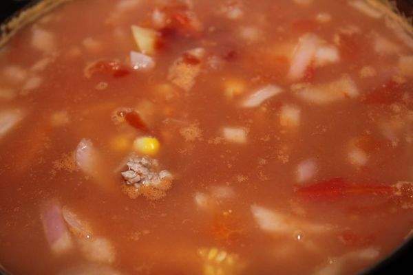 4. Đặt hạt ngô và thịt bò vào súp, thêm hành tây, muối trong 5 phút và thêm một ít nước sốt cà chua