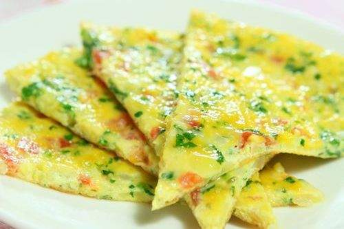 3. Thêm rau bina xắt nhỏ, cà chua thái hạt lựu và hành tây thái hạt lựu lần lượt. nó Thêm một muỗng muối và trộn các thành phần trong bát tốt vào một miếng trứng. nó Sau khi sưởi ấm chảo, đổ một lượng nhỏ dầu và dầu nóng 7 phút. Đổ bột trứng, chiên cả hai mặt cho đến khi vàng nâu và tắt lửa. nó Sau khi làm mát một chút, sử dụng một con dao để cắt nó thành từng mảnh theo sở thích của bạn và phục vụ nó.