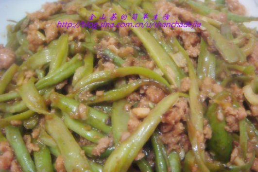 1. Chọn đậu và rửa chúng. nó Cắt nó thành các mảnh vụn. nó Cắt thịt lợn nạc thành băm nó, thêm một ít muối, nấu rượu và một chút tinh bột ướt để ướp trong một thời gian.