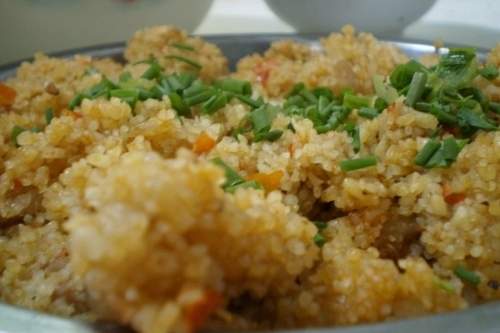 2. Chiên gạo thơm trên lửa nhỏ và cho vào một cái bát để làm hạt gạo có độ dày khác nhau, và trộn đều với bụng lợn ướp