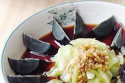 2 bím tóc với tỏi, nửa muỗng cà phê tinh chất gà chi tiêu 1 muỗng cà phê dầu 1 muỗng cà phê đường2 muỗng cà phê nước tương, 2 dưa chuột, 2 trứng gọt vỏ, 1 muỗng cà phê giấm thơm1 muỗng cà phê dầu mè