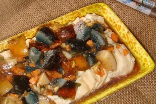 3. Cắt tỏi và cà rốt thành bọt nhỏ, trộn đều với dầu mè, giấm lilac đậu tươi và đường trắng. Sau đó trộn các quả trứng và gia vị bóc vỏ với nhau, và trải đều những quả trứng bóc vỏ hỗn hợp trên đậu phụ
