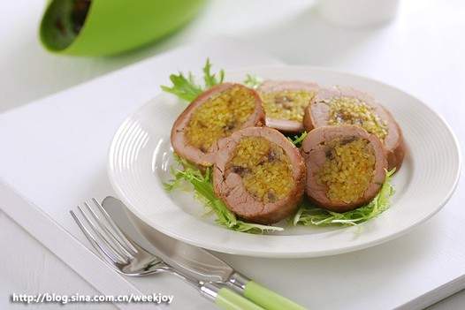 <img alt = "Cream Rice Pork Roll Phương pháp 12" src = " Sau khi nướng, lấy ra cuộn thịt, cắt nó thành các lát 1cm và đặt nó lên đĩa