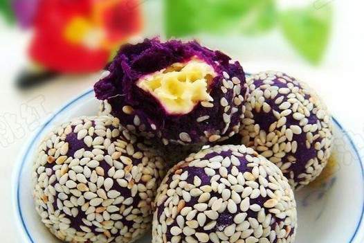 7. Đặt các quả bóng khoai tây màu tím vào hạt mè và cuộn chúng xung quanh và dán chúng bằng hạt mè