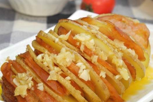 6. Đổ bơ được vi sóng và tỏi băm lên trên khoai tây
