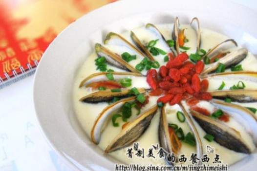 9 nghêu, 3 trứng và một ít WolfberryMột ít hành lá xắt nhỏ, một muỗng muối, một ít hạt tiêu, một nửa thìa shao rượu một cốc và một nửa cốc nước dùng