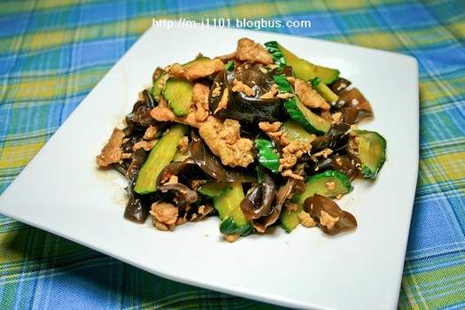3. Đun nóng chảo và thêm dầu và thêm lát thịt và hành lá và lát gừng lại với nhau để xào các lát thịt và thêm nấm. Chiên trứng rán, nước tương, muối và đường trong khoảng 3 phút, thêm lát dưa chuột và xào trong 1 phút, thêm tinh chất gà và xào trong một thời gian. Sau đó nó sẽ được phục vụ