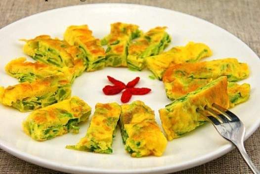 8. Đổ chất lỏng trứng dưa đắng và chiên từ từ trên lửa thấp cho đến khi đáy đông cứng