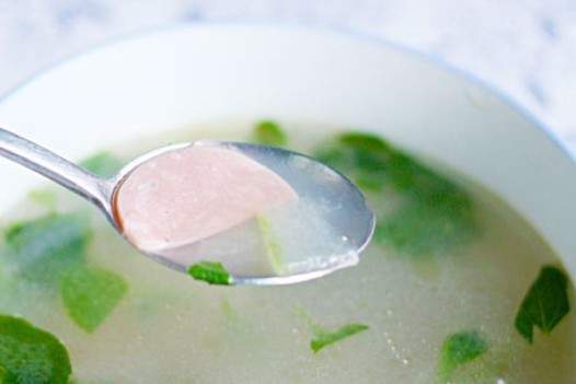 6. Thêm những lát giăm bông, rửa sạch hạt cải dầu nhỏ và nấu trong nửa phút. Thêm muối, tinh chất gà, hạt tiêu trắng và dầu mè, khuấy đều và phục vụ