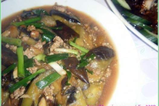 7. Thêm cá muối, thịt lợn băm nhỏ cà tím vào nấu rượu, nước tương, đường, bột gà và hạt tiêu để nếm, thêm nước và nấu trong 2 phút, thêm dầu mè và xào giếng, thêm lát hành tây, và đặt vào đĩa