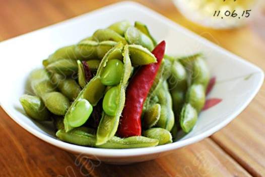 1 jin của edamame tươi, 3 sao anise, một miếng quế nhỏThành phần 1 muỗng rượu 5 ớt khô, 1 muỗng cà phê hạt tiêu, 1 muỗng muối, 1L nước