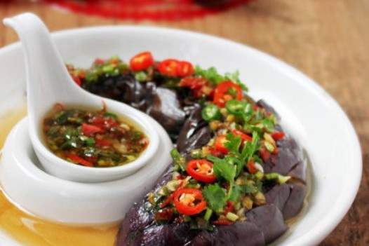 1 cà tím, 2 ớt đỏ, 3 ớt xanh4 tỏi, một lượng nhỏ rau mùi, muối, đường, nước tương hấpNước sốt hàu, hạt tiêu, dầu ô liu