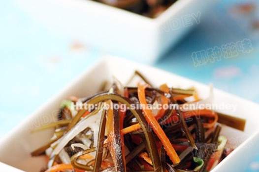 3.2 Ngâm Tảo bẹ, cắt thành các mảnh vụn tảo bẹ và đặt chúng vào một cái bát để đặt sang một bên. Rửa cà rốt và cắt chúng thành dải mỏng; Rửa sạch các loại đậu.
