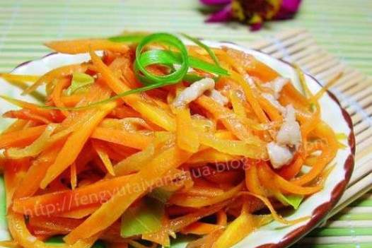 1. Cắt thịt thăn thịt lợn thành vụn, rắc một ít nước, nước tương nhẹ và muối để nếm trong khoảng 15 phút, thêm tinh bột khô và trộn đều cho đến khi không có bột khô, sau đó thêm một ít dầu và trộn đều, cắt một củ cà rốt thành vụn và đặt hành tây xanh