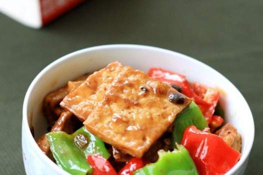 2.12 Cắt đậu phụ thành các lát, xé ớt xanh và đỏ thành những miếng nhỏ, cắt hành tây, gừng và tỏi thành băm