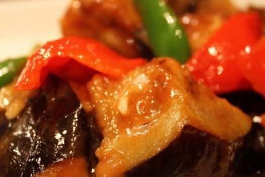 1. Cắt một miếng cà tím bằng một lớp tinh bột mỏng, rắc một lớp ớt xanh và đỏ mỏng thành từng miếng, và đặt sang một bên