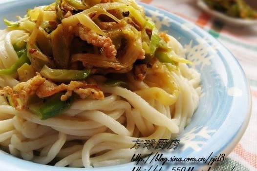 2.1 cuối cùng, ném ớt vụn vào và xào trong một thời gian. Không cần phải thêm muối vào đây, bởi vì các loại rau ngâm có độ mặn. Sau khi mì được nấu chín, phục vụ chúng và đổ chúng vào các loại rau ngâm vụn.