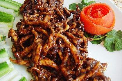 9. Để lại dầu đáy trong nồi, đổ vào sốt mì ngọt và xào tốt. nó Chiên tốt và đổ vào thịt lợn xốp và xào. nó Chỉ cần đợi tất cả thịt lợn vụn với nước sốt đều.