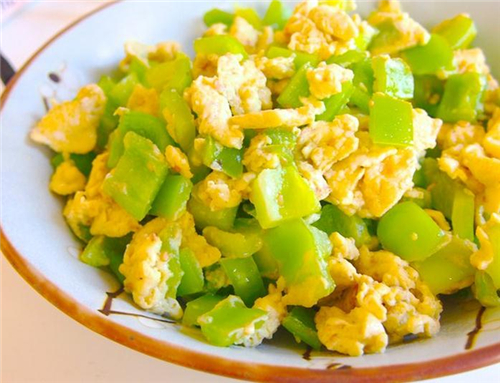 3. Thêm một lượng nhỏ dầu vào nồi, đổ vào ớt và xào, thêm muối, xào đều, và sau khi ớt thay đổi màu, thêm trứng chiên trước, xào một vài lần, rồi đặt nó ra.