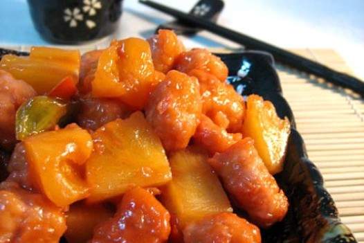5. Cuối cùng, thêm tinh bột nước, và khi nước sốt cho đến khi nó dính và keo, thêm thịt chiên và các miếng dứa, trộn và xào đều