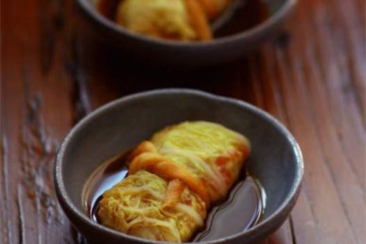 5. Đun sôi nước trong nồi, đặt các cuộn bắp cải theo trình tự, thêm nước tương nhẹ, hạt tiêu đen và muối, và nấu trong 5 phút