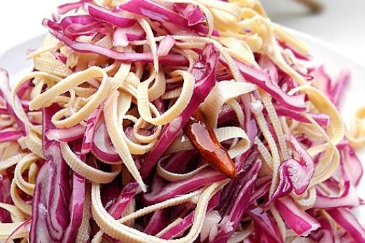 Bắp cải tím 150g Đậu phụ da 50g tỏi băm nhỏHành lá nhỏ, hạt tiêu khô, hạt tiêu, giấm trắngĐường, muối và dầu