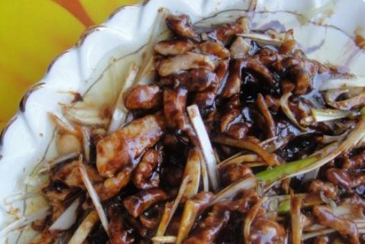 1. Nửa pound thịt lợn nạc, một lon nước sốt mì ngọt kiểu Bắc Kinh, cắt hành lá thành một lát vuông, cắt da đậu phụ thành ba lát gừng