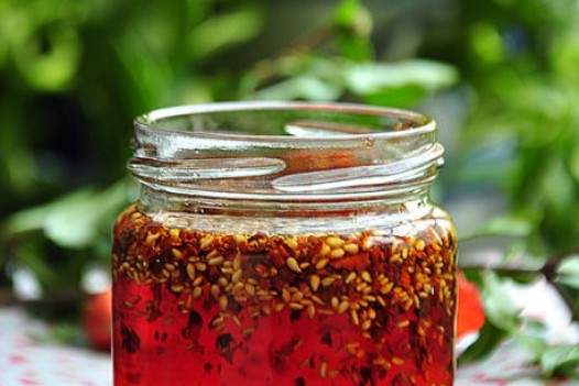 9. Đổ tất cả dầu từ từ. Dầu phải được phủ bằng ớt và hạt vừng. Nếu bạn thích dầu ớt, bạn có thể thêm nhiều hơn. Một số người trên Baidu nói rằng việc thêm một vài giọt giấm có thể tăng cường hương vị, bạn có thể tự làm điều đó! Cá nhân tôi không cảm thấy nó, và tôi thích nó mà không có giấm