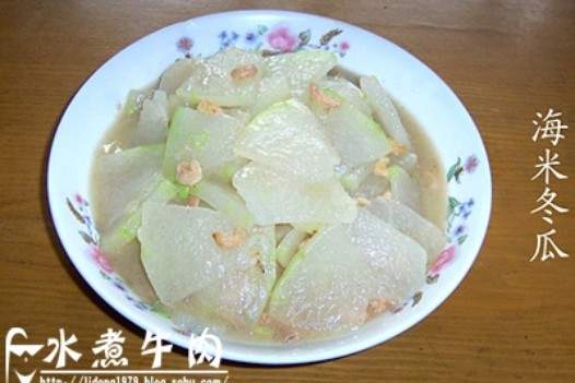 2. Put the heat on the wok, add a little base oil, heat it up and stir-fry it with chopped green onion, add the winter melon and stir-fry quickly, cook a little cooking wine, add salt and sea rice