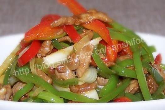1. Cắt thịt nạc thành các mảnh vụn, trộn trong muối, nước tương nhẹ, nước tương sẫm màu, rượu nấu ăn, tinh bột và khuấy đều, cắt hạt tiêu xanh đỏ thành vụn trong một thời gian