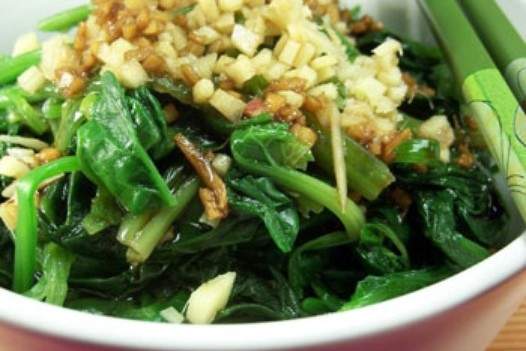 2.1 Một nửa gừng được rắc lên rau bina vảy, và thêm nước tương nhẹ, giấm và dầu mè để làm nước sốt và để nó trong một thời gian