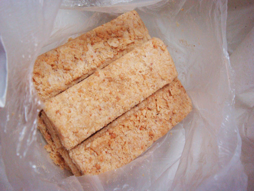 5. Xoay cả hai bên sang giữa và trở thành dải dài. Trong khi đường chưa lạnh, kéo dài chiều dài 1/3 ~ 1/2. Cắt nó mở và bạn có thể ăn bánh đậu phộng.